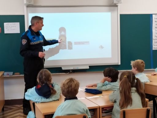 Para ello en un primer momento contamos con la visita de dos agentes de la Policía Municipal que nos impartieron una charla en nuestras aulas sobre algunas normas de seguridad vial y señales de tráfico que como peatones son importantes que conozcamos.