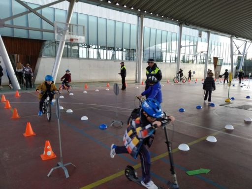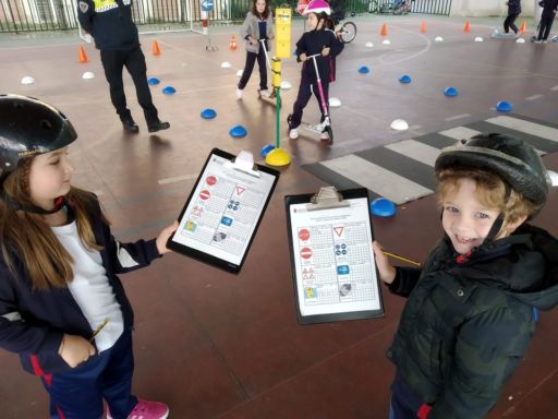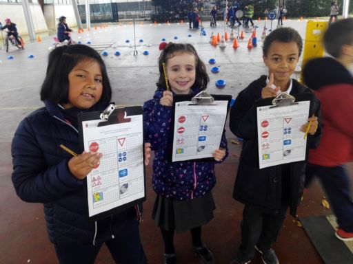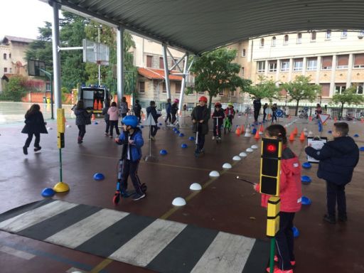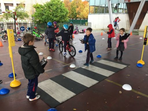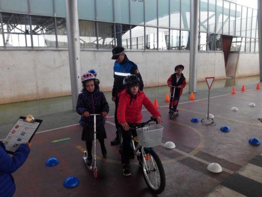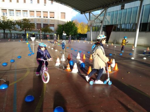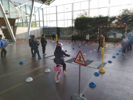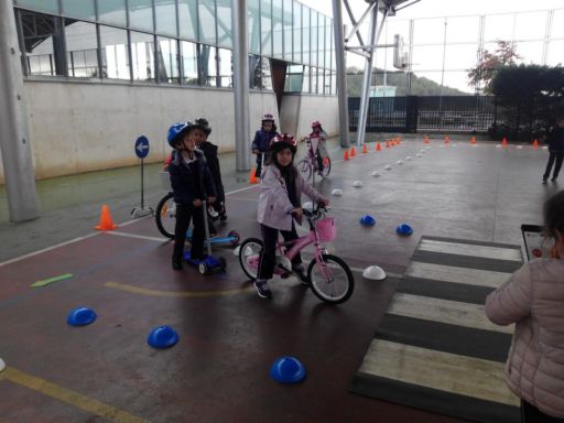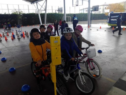 En otro momento realizamos un circuito con bicis y patinetes, en el que además de ser peatones, pudimos ponernos en el lugar de los conductores. Comprendimos la importancia de respetar las normas de tráfico y algunas medidas de seguridad que hemos de tomar tales como atarnos el cinturón, utilizar casco cuando andamos en bici o patinete…