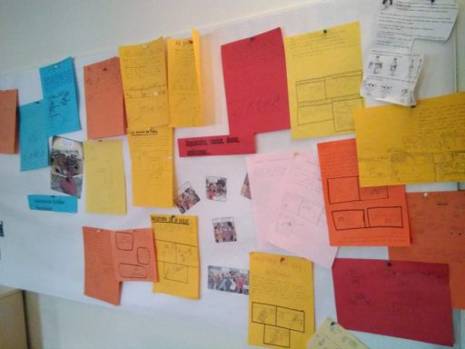 En el taller hemos trabajado sobre las semejanzas y diferencias entre la vida de los personajes africanos de la novela y nuestras propias vidas y hemos construido un mural con los borradores de cómics que hemos realizado.