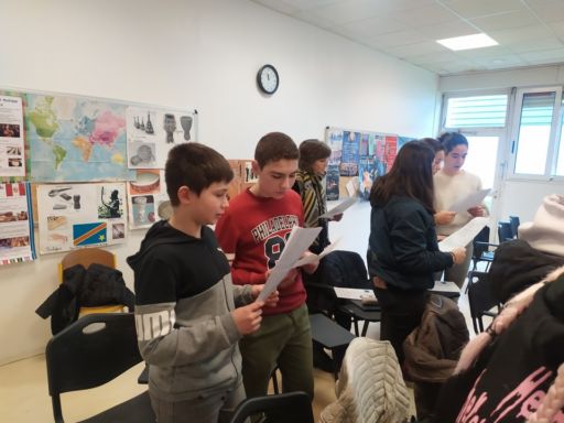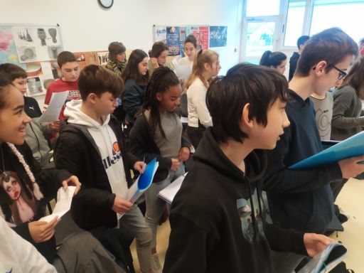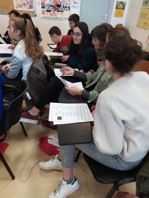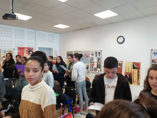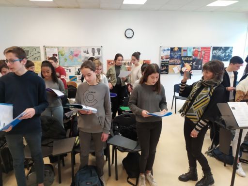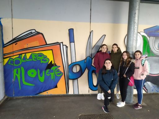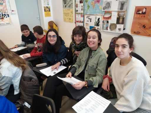 Esta mañana hemos llegado al cole y hemos desayunado en la cantina con nuestros compañeros franceses. El director junto con las profesoras que han organizado el intercambio nos han recibido y nos han deseado una buena estancia en Pessac. Después, por grupos, hemos acudido a clase de diferentes asignaturas: francés, español, ciencias, geografía e historia… hemos cantado y bailado en clase de música.