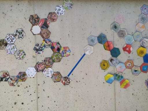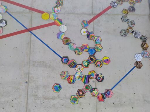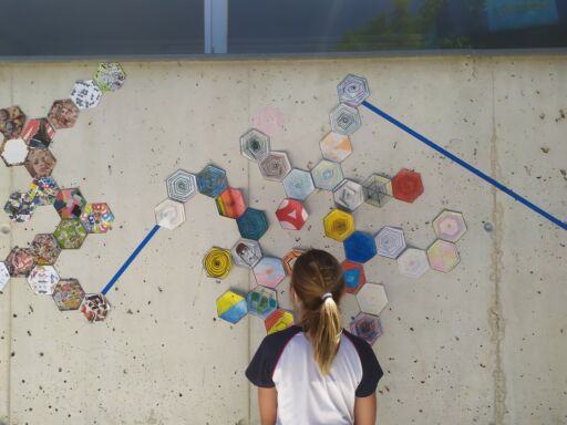 ¿Puede encontrar tu hijo/a el hexágono que ha construido? Mientras lo buscas, piensa en las redes y conexiones que hace con los demás integrantes del mural. Éste es el de mi amiga….., mira lo que se le ha ocurrido a…, y así surgen un sinfín de comentarios que les ayuda a crecer en la observación, parte fundamental de la ciencia y en la imaginación, pilar de las expresiones creativas y artísticas.
