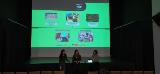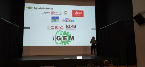 Judith Carlos, alumna de 2º de Bachillerato del colegio, junto con Sarah y Nahia, instructoras del equipo, ha presentado el trabajo que ha realizado este verano el equipo Navarra-Biogalaxy-4 al alumnado de ciencias de la salud de 1º y 2º de bachillerato.