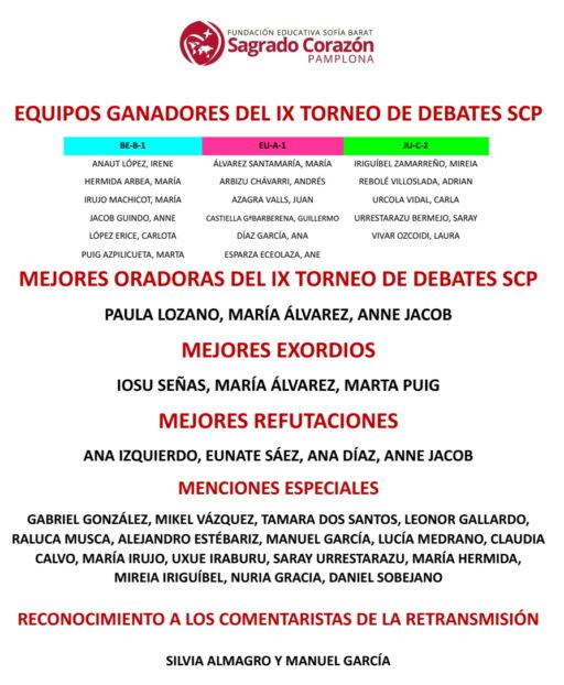 Ya se ha realizado la entrega de diplomas a los participantes de la IX edición de nuestro Concurso de Debates de Filosofía en 1º de Bachillerato. No solo recibe el premio el equipo ganador sino que se valoran distintas categorías como mejores exordios y refutaciones, menciones especiales y algunos reconocimientos. ¡Enhorabuena a tod@s!